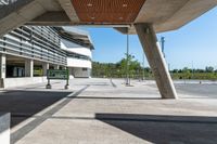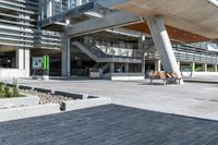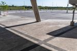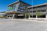 A view of the city of Toronto with clear skies and an open space, showcasing the urban design and city life. The low-profile parking deck and garage can be seen alongside the road paved with pavers.