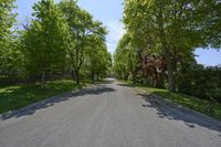 A straight road in a residential area of Toronto, Canada. The asphalt road is surrounded by grass, trees, and beautiful houses. It's a sunny day with clear skies, showcasing the natural environment and green vegetation in this suburban neighborhood.