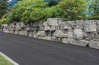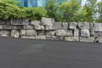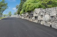 A view of a straight road in a residential area of Toronto, Ontario, Canada. The road surface is made of asphalt, and it is surrounded by grass, trees, and shrubs. The modern architecture of office buildings can be seen in the business district. The road is flanked by a stone wall and a fence, and there is a limestone outcrop on the slope. The infrastructure includes a curb, a driveway, and a highway with a shoulder. The photo showcases the geology, vegetation, and profile of the area.