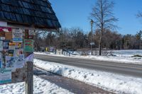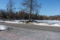 A view of a suburban road in Toronto, Ontario, Canada on a clear sky day. The asphalt road leads through a residential suburb, with trees casting long shadows. This straight road is perfect for recreational activities in the park nearby.