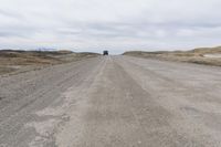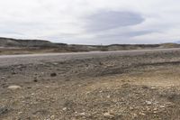 A scenic view of a straight road leading through the red rock desert landscape of Utah, USA, under a grey sky. The road, surrounded by low sand dunes and gravel, resembles a lunar landscape in San Rafael Swell, Canyonlands.