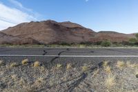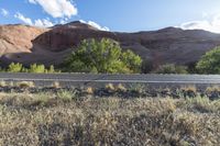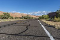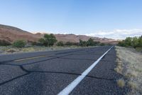 A low angle view of a straight road leading through Utah's Canyonlands, with red rock formations and mountains in the distance. The clear sky at dawn creates a stunning landscape with the sun visible.