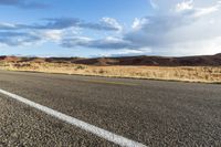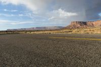 A scenic view of a straight road cutting through the red rock landscape of Utah's Canyonlands National Park, with mountains in the distance and a clear blue sky with fluffy white clouds.