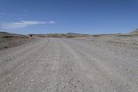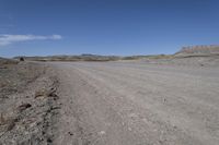 A low road winds through the red rock and sand of Utah's desert landscape in the San Rafael Swell, providing a scenic off-road track. The clear sky and rugged mountain landforms create a stunning natural environment.