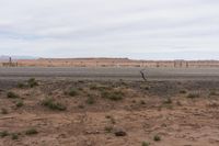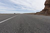 A low angle view of a straight road cutting through the stunning red rock landscape of Utah's Canyonlands in the San Rafael Swell. The grey sky and clouds add a dramatic touch to the nature scenery on a bright sunny day.