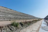 a large hill covered in dirt and weeds near the highway side side and road that passes through