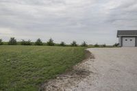 A gravel road stretching out to the horizon, lined with pasture and agriculture, on a grey day in rural Bancroft, Iowa. The surface is a mix of grass, dirt and open space, dotted with a few trees and a farm shed.