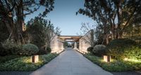 A beautiful dawn breaks over a residential villa in Suzhou, China, casting a warm light over the open space and courtyard. The clear sky reflects on the surface of the nearby lake, creating a serene and tranquil atmosphere. The straight road leads to various recreational areas, inviting residents and visitors to explore the natural beauty of this suburban haven.