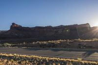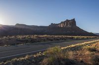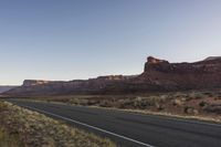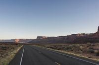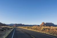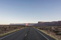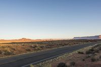 A straight road stretches into the horizon in the desert highlands, showcasing the rugged terrain and clear sky.