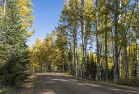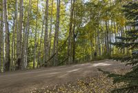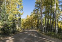 A gravel road winding through a grove of trees in a lush forest with autumn-colored leaves in a temperate broadleaf and mixed forest biome.
