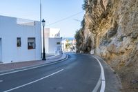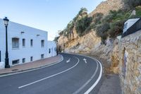 A view of a straight road lined with modern architecture and residential buildings in Spain, showcasing the beautiful European landscape and clear sky.