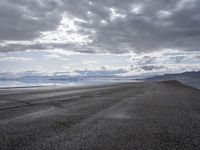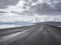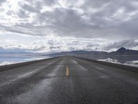 A view of the Bonneville Speedway in Utah, USA, with the sun visible in the horizon. The asphalt highway stretches out towards the shoreline of the sea in the distance, with a grey sky and a calm atmosphere. The sand, water, and open space of the natural environment give a feeling of a vast plain and a highland. The lake and mountain in the background complete the landscape, with sunlight hitting the road surface in a straight line.