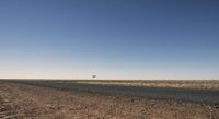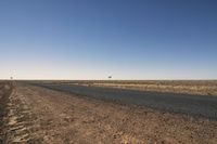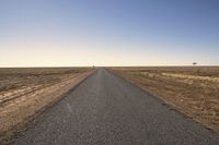 A straight road stretches through the vast desert landscape in Queensland, Australia. The rugged terrain and clear sky create a stunning view as the dawn breaks over the horizon.