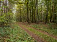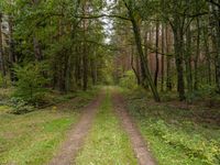 A gravel road stretches straight down the road through the deciduous and evergreen forests of Berlin, Germany. The terrestrial plants, lush vegetation, and green shrubs cover the ground in the autumn day, while the clouds hang above the trees and wood floors.