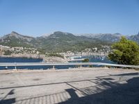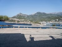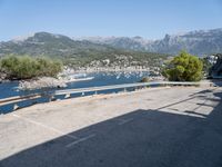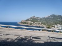 On a clear day in Mallorca, Spain, the Armco barrier follows a straight road through the coastal landscape, leading to the Balearic Islands and the ocean beyond. Nature, mountains and a parking lot can be seen in the distance.