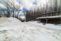 A straight road in the rural outskirts of Canada, covered in snow on a cloudy day.