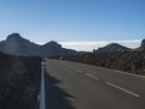 A straight road with bedrock and asphalt surface cuts through the rugged mountain range in Tenerife, Spain. The low vegetation and clear sky create a picturesque rural landscape in this European national park.