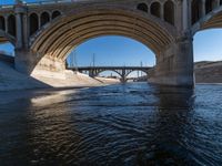 An aerial view of the Los Angeles, California, USA suburb at break of day with a river, concrete street, underpass, bridges, walls and residential homes. The view is from a high position, with clear sky and hard shadows creating a top down view of the open space below.