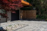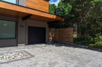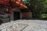A beautifully designed suburban home located in Toronto, Ontario, Canada, surrounded by lush green grass and tall trees. The home features a spacious courtyard and a well-maintained parking garage. The bright sunlight casts shadows on the paved surface, creating an interesting play of light and shadow on the house.