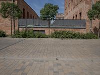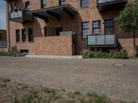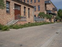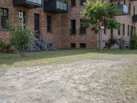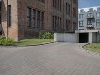 A classic brick building in Berlin, Germany, surrounded by a cobble stone driveway, a gravel walkway, and a lawn of lush vegetation. The mixed-use property is part of a residential area, and a clear day reveals a view of the neighborhood's infrastructure and urban architecture.
