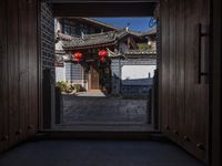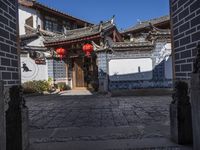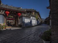 The cobble stone street leads to a small residential neighborhood in Lijiang, Yunnan province, China. The small street is lined with classic architecture and trees, creating a peaceful, old-town vibe. The skyline is filled with both urban and nature elements, providing a unique backdrop for tourists and locals alike.
