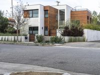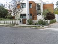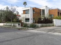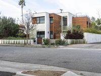 A residential area in the US city of Los Angeles, California featuring townhouses, villas, and apartment buildings. Trees line the driveway and suburban grass hug the curb as the sun shines on the urban architecture of the neighborhood.