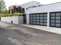 A residential area in Los Angeles, California USA featuring a composite material house with a driveway, curb, entry, garage door, fence, road surface, and public space.