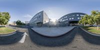 A curved road meanders through a suburban neighborhood, passing trees and vegetation. Automobiles travel along the asphalt road surface, illuminated by the clear sky of a new dawn.