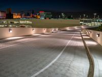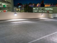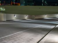The asphalt driveway of a residential parking deck in Los Angeles, USA, illuminated by artificial light and street lamps in the dark of night.