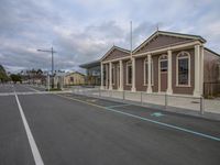A view of a peaceful suburban residential area in the city with houses, buildings, and a parking lot.