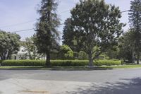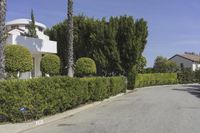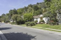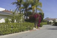 This image shows a suburban residential area with a winding road in Los Angeles, California, USA. The view includes a mix of homes, trees, vegetation, and a hill, with palm trees in the foreground. A low hedge frames the S-curve of the road as it winds its way down the hill, with a landscape of grass and gardens in the background.