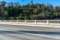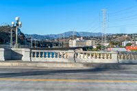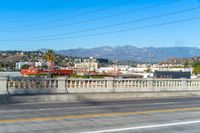 A residential street in the suburbs of Los Angeles, California with asphalt road surface, overhead power lines, traffic light, bridge, split-rail fence, street light, and mountain landscape in the background. Clear sky and vegetation on both sides of the road.