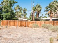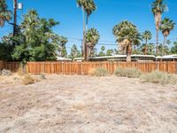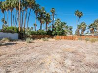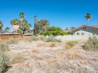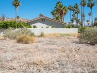 A mid-century road in Palm Springs, California stretches out into the Sonora Desert. The gravel and dirt surface is surrounded by grass, bush, and palm trees, while a low fence separates the wasteland from the residential area. The clear sky provides a great backdrop for the off-road track.