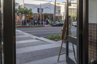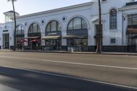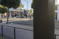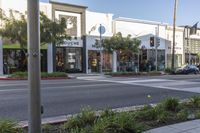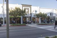 A mixed-use neighborhood in Beverly Hills, California, USA, showing a residential area, public space, urban design, and infrastructure, including a personal luxury car parked in front of a storefront, a restaurant, and an office building with a tree in the foreground and a clear sky in the background.