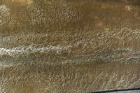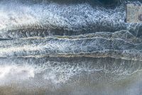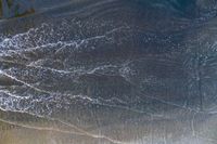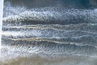 A top-down view of a suburban road in Los Angeles, California, USA, surrounded by open space and wet river water, with hard shadows emphasizing the elevated position of the aerial view.