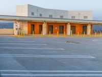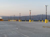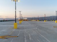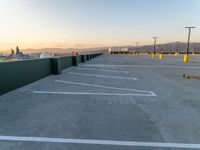 Aerial view of a parking deck in a Los Angeles suburb at the break of day, illuminated by artificial light and framed by a concrete street and asphalt driveway.