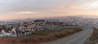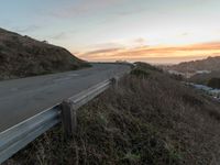 An elevated view of the road and Armco barrier in the suburban area of San Francisco, California, with a clear sky and sun shining down on the asphalt and dirt surface.