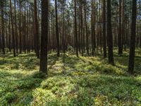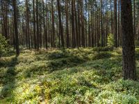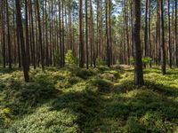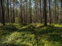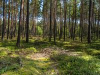 A lush, green forest landscape in Brandenburg, Germany, with a small road winding through the deciduous trees and incidental people walking along the grassy groundcover. Larch trees, terrestrial plants, and vegetation provide a canopy of life in this biome.