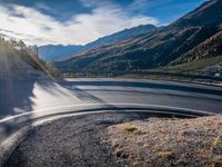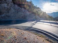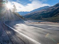A winding road with an Armco barrier curves around a mountain in Switzerland, Europe. A bright sunny day makes the contrail shadows visible in the landscape, and the sun is shining on the road.