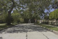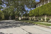 A view of the Arecales biome in the city of Los Angeles, California, USA. The scene shows a residential estate, with a hill, a S-curve highway, palm trees, and a church in the background. A clear sky, dotted with clouds and contrails, frames the skyline.