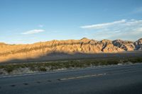 A breathtaking view of the California landscape at dawn, showcasing the vibrant vegetation, majestic mountains, and vast open plain. The clear sky and sunlit clouds create a picturesque scene, while a road stretches across the terrain, leading towards the horizon.