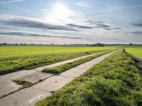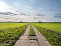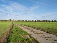 A beautiful clear sky provides a stunning backdrop to a lush landscape of grass and trees alongside a concrete thoroughfare in Berlin, Germany on a sunny autumn day.