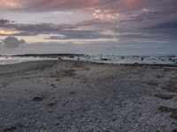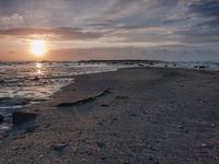 A breathtaking landscape of a sunny beach at dawn, with the afterglow of sunlight reflecting on the calm lake shore.