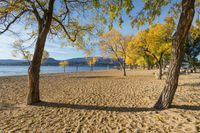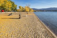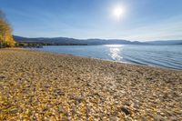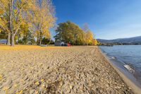 A beautiful sunny day at Gyro Park Beach in Kelowna, British Columbia, overlooking the azure waters of Okanagan Lake. The sandy beach is surrounded by lush vegetation and towering trees, providing a perfect spot to relax and enjoy the natural environment.
