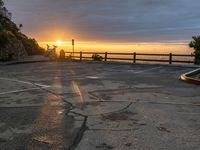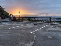 A tourist enjoys the sunny cityscape view of the urban horizon from a rural parking lot, with grey clouds, wet asphalt, open space, trees and a fence in the foreground.