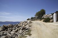 Scenic view of a medium format road surrounded by mountains, trees, and rocky terrain on the coastal region of Mykonos, Greece. The clear blue sea and sunny sky add to the picturesque beauty of this rural beach. Perfect for tourism and exploring the natural beauty of Greece.