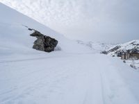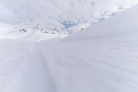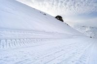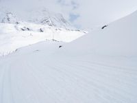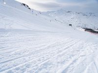 A tourist takes in the beautiful view of the winter landscape of the Alps, including a ski track, snow-capped mountains, clear skies, and an open valley below. Tourists from all over Europe flock to this picturesque tourist attraction on sunny days like this one.