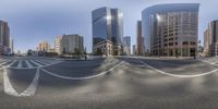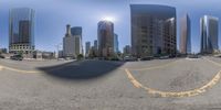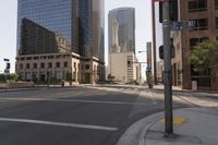 A view of downtown Los Angeles, California, USA, on a sunny day. Automobiles driving along the road in this metropolitan area are surrounded by buildings, neighborhoods, and other urban infrastructure.