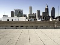 A sunny day in Los Angeles, California, USA, reveals a view of the city's metropolitan area: skyscrapers, high-rises, concrete buildings, parking garages, technology, roads, public spaces, and more, all under a clear blue sky.