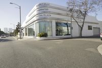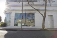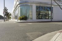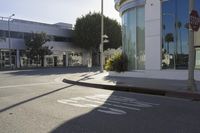 A view of the modern architecture and residential area of Los Angeles, California, USA. Sky-high office buildings, urban public space, mixed-use storefronts, and bustling city streets can be seen in the background. The sun is visible in the clear sky, casting a shadow on the trees, asphalt road surface, low walls, and tile facades.